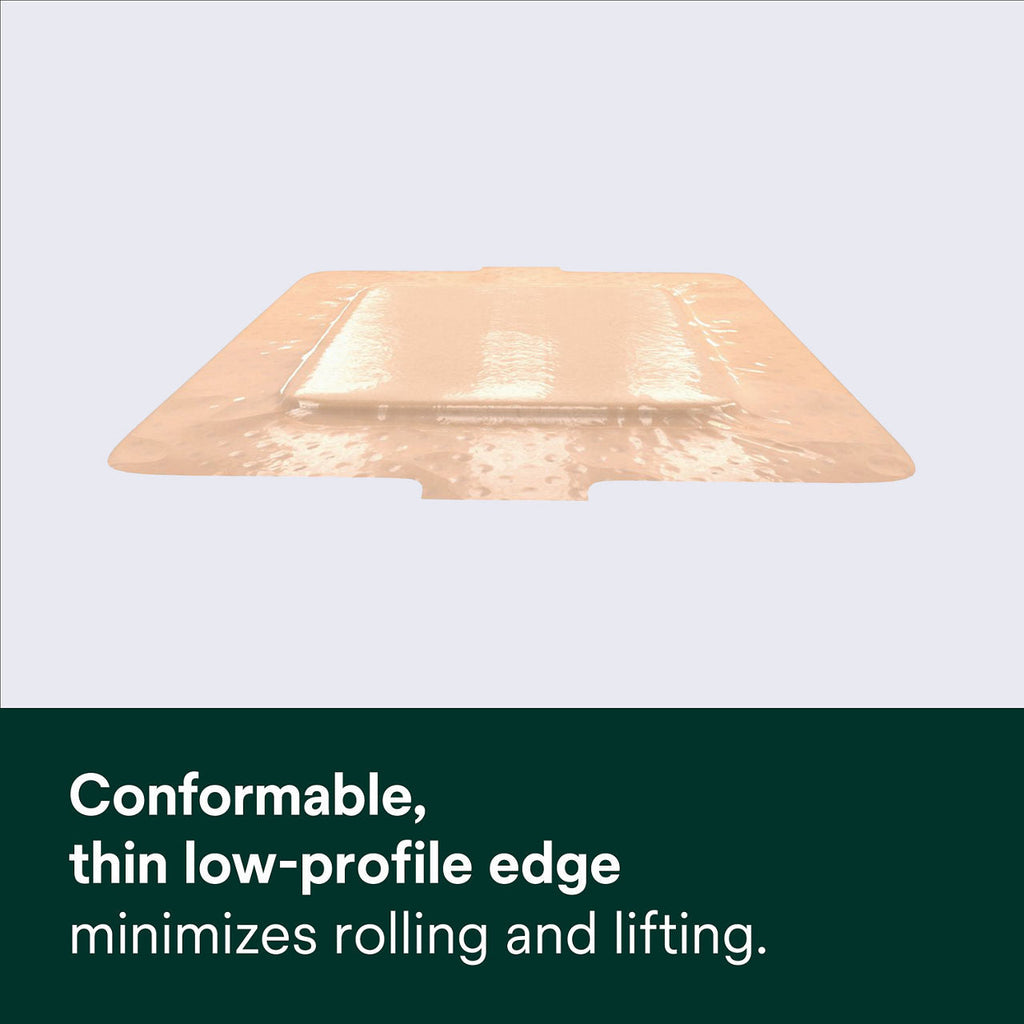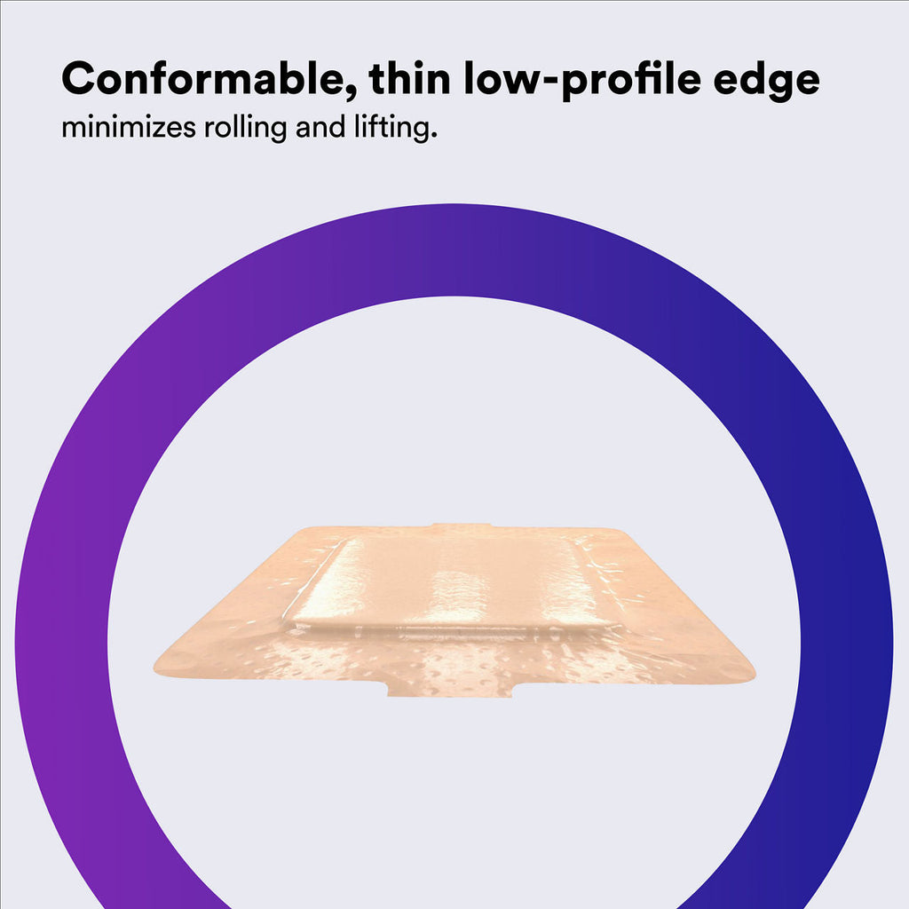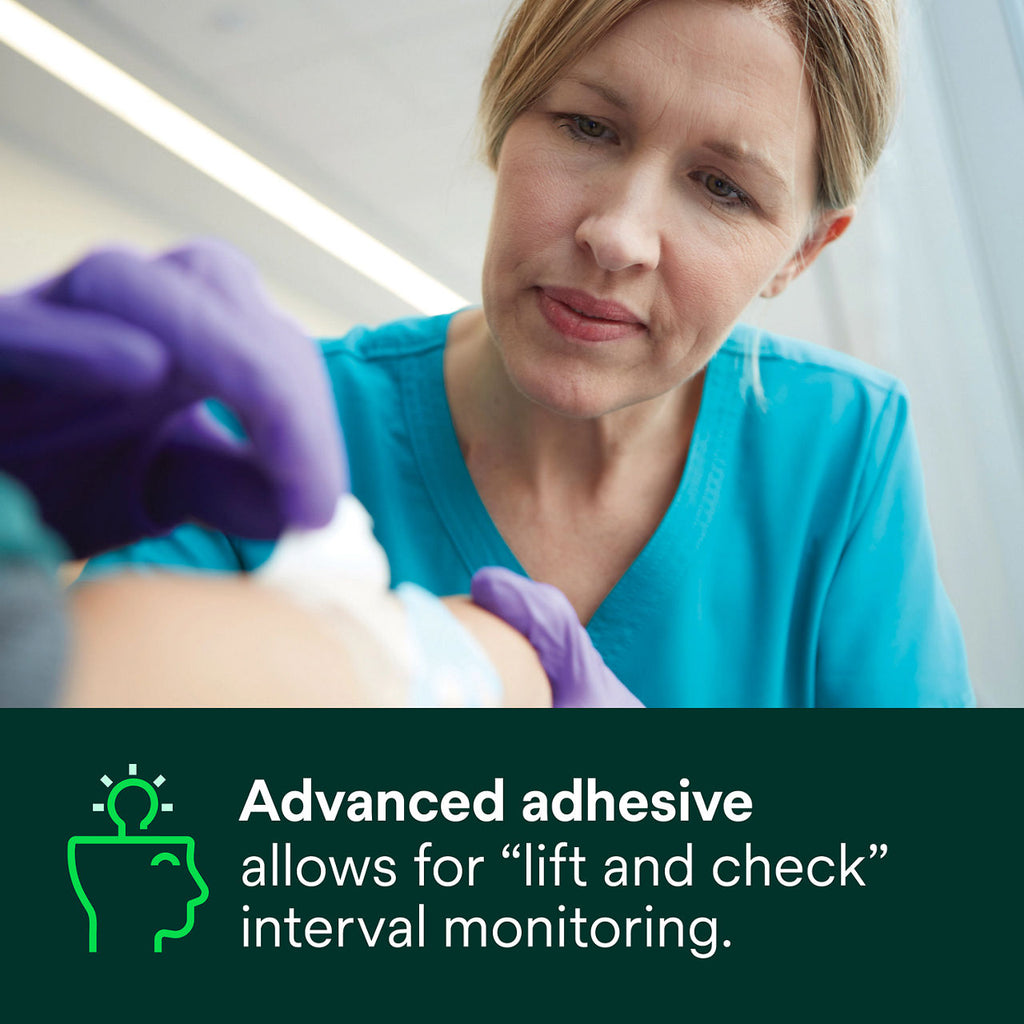 • Un adhesivo de silicona fuerte y suave mantiene el apósito en su lugar con una mínima alteración de la piel durante su extracción.