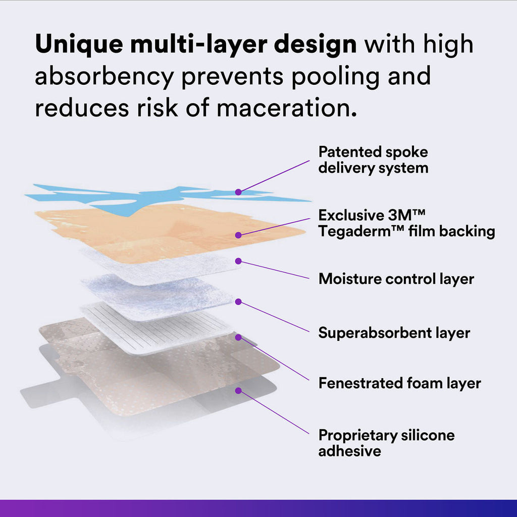 • Ayuda a mantener la cantidad adecuada de humedad necesaria para la curación: el diseño multicapa absorbe y evapora la humedad para ayudar a reducir la posibilidad de maceración de la piel.