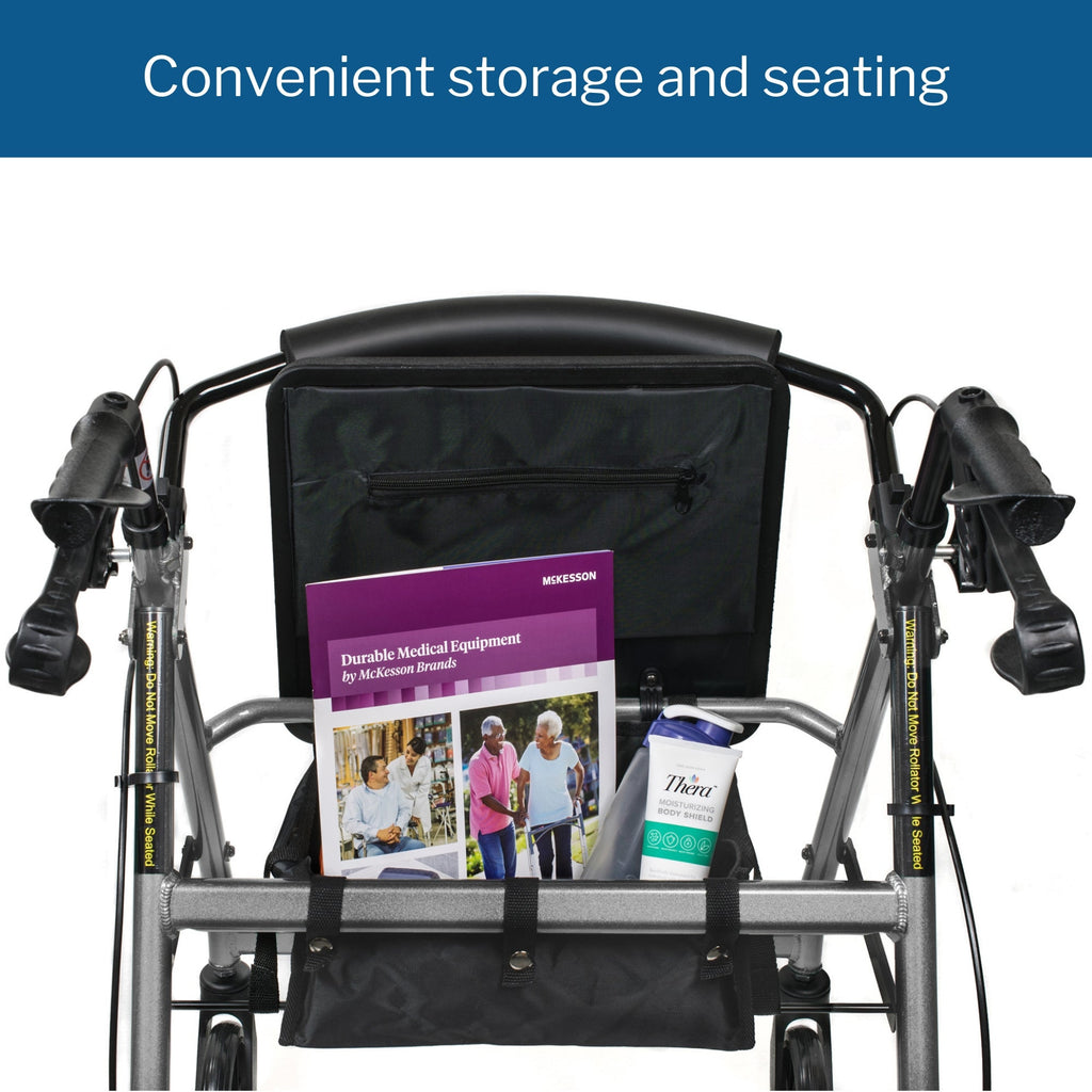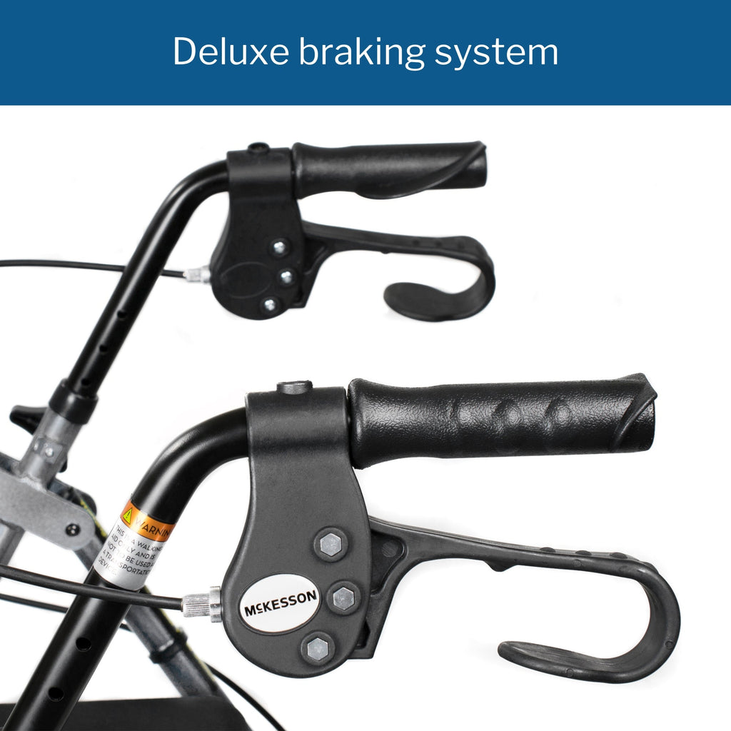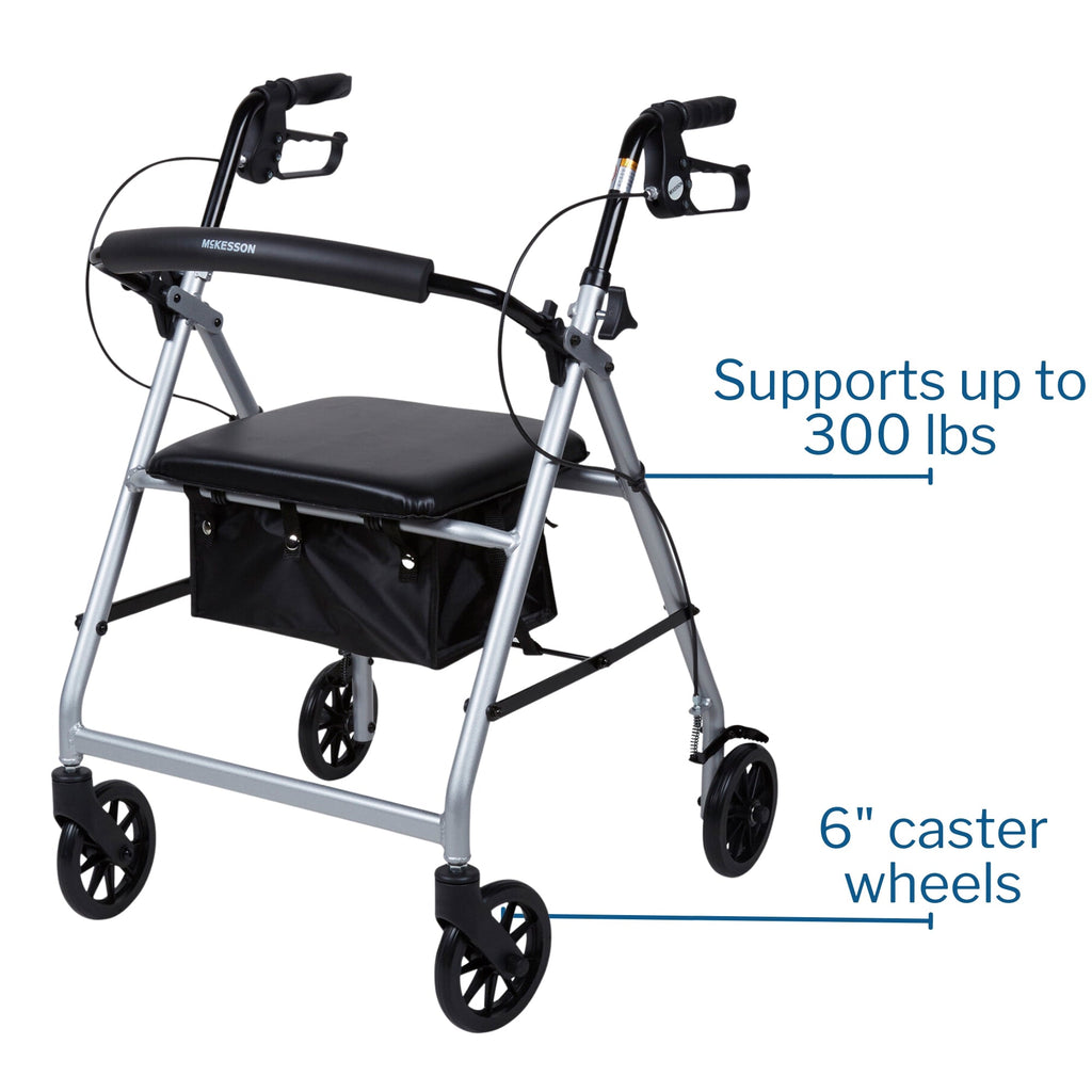 A diferencia de los andadores tradicionales, el andador plegable McKesson no necesita ser levantado con cada paso, lo que lo convierte en la opción ideal para quienes tienen problemas de fuerza en los brazos. Los frenos de mano incluidos ayudan a mantener el control, mientras que las manijas ergonómicas son fáciles de agarrar, reducen la presión en las manos y se ajustan para adaptarse a la altura y preferencias de cada usuario. Este andador también puede usarse como asiento acolchado, con un respaldo abatible y acolchado que se puede plegar o desmontar. El armazón de acero azul soporta de forma segura a usuarios de hasta 136 kg (300 libras), con una bisagra plegable para facilitar su almacenamiento y transporte.
