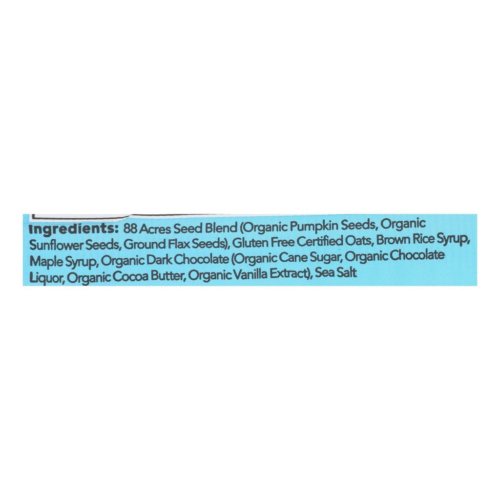 La barra de granola artesanal de semillas de chocolate y sal marina 88 acres está hecha con la mezcla de semillas orgánicas de girasol, calabaza y lino de 88 acres. También contiene jarabe de arce, chocolate negro orgánico y sal marina. Cada barra de 47 g contiene 200 calorías y 10 g de grasa total. Nuestra barra de granola no contiene gluten, OMG ni frutos secos.