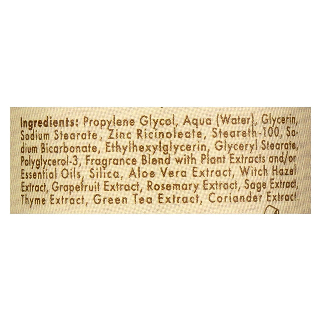 Ingredientes: propilenglicol, agua, glicerina, estearato de sodio, ricinoleato de zinc, esteareth-100, bicarbonato de sodio, etilhexilglicerina, estearato de glicerilo, poliglicerol-3, mezcla de fragancias con extractos de plantas y/o aceites esenciales, sílice, extracto de aloe vera, extracto de hamamelis, extracto de pomelo, extracto de romero, extracto de salvia, extracto de tomillo, extracto de té verde, extracto de cilantro.