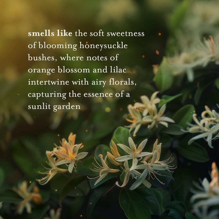 Como una gota de lluvia deslizándose por una hoja verde, empujada por una abeja hacia las panículas de una madreselva en flor; con un ligero toque de lila blanca.