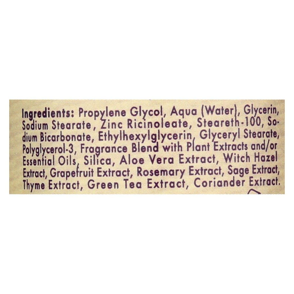 Ingredientes: propilenglicol, agua, glicerina, estearato de sodio, ricinoleato de zinc, esteareth-100, bicarbonato de sodio, etilhexilglicerina, estearato de glicerilo, poliglicerol-3, mezcla de fragancias con extractos de plantas y/o aceites esenciales, sílice, extracto de aloe vera, extracto de hamamelis, extracto de pomelo, extracto de romero, extracto de salvia, extracto de tomillo, extracto de té verde, extracto de cilantro.