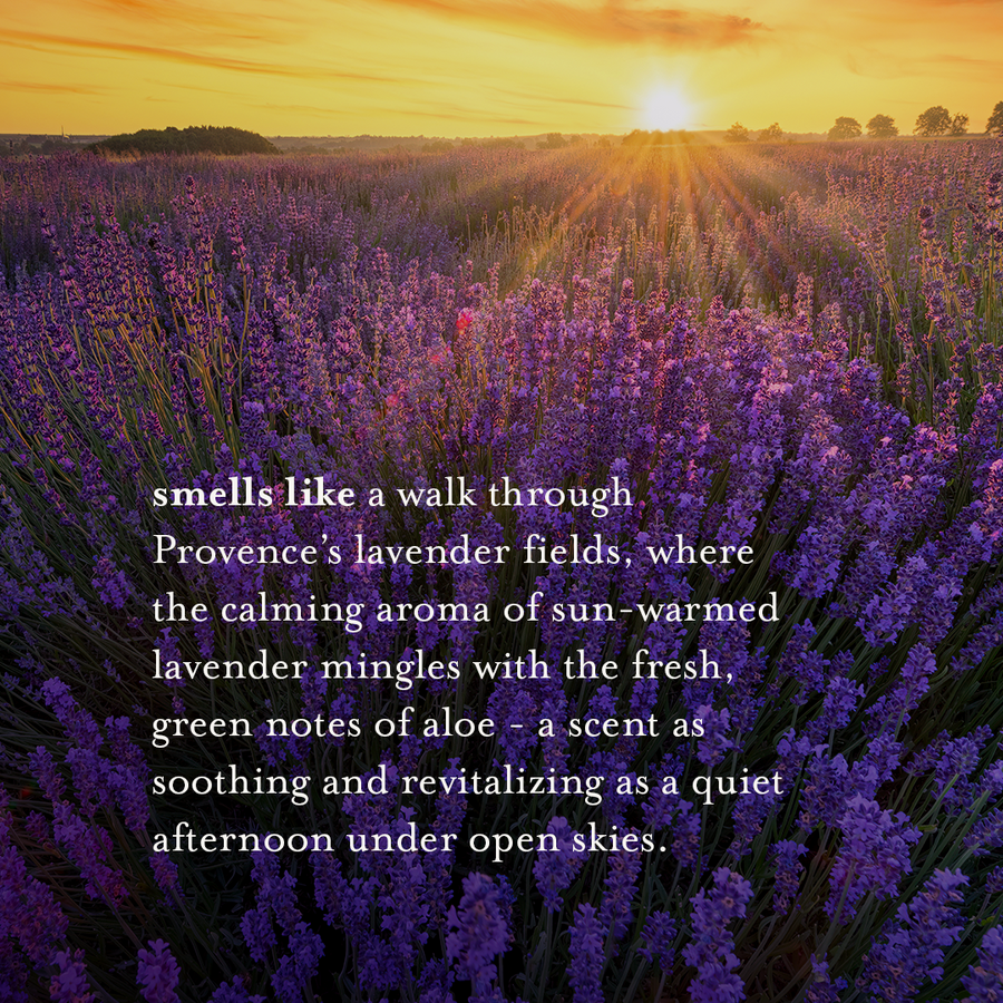 Entre los interminables campos de lavanda, descubrirás el aroma más emblemático que ha ensombrecido la región de Provenza durante siglos. Un aroma floral, pero a la vez... almizclado y ambarado; con un refrescante toque de aloe y eucalipto.