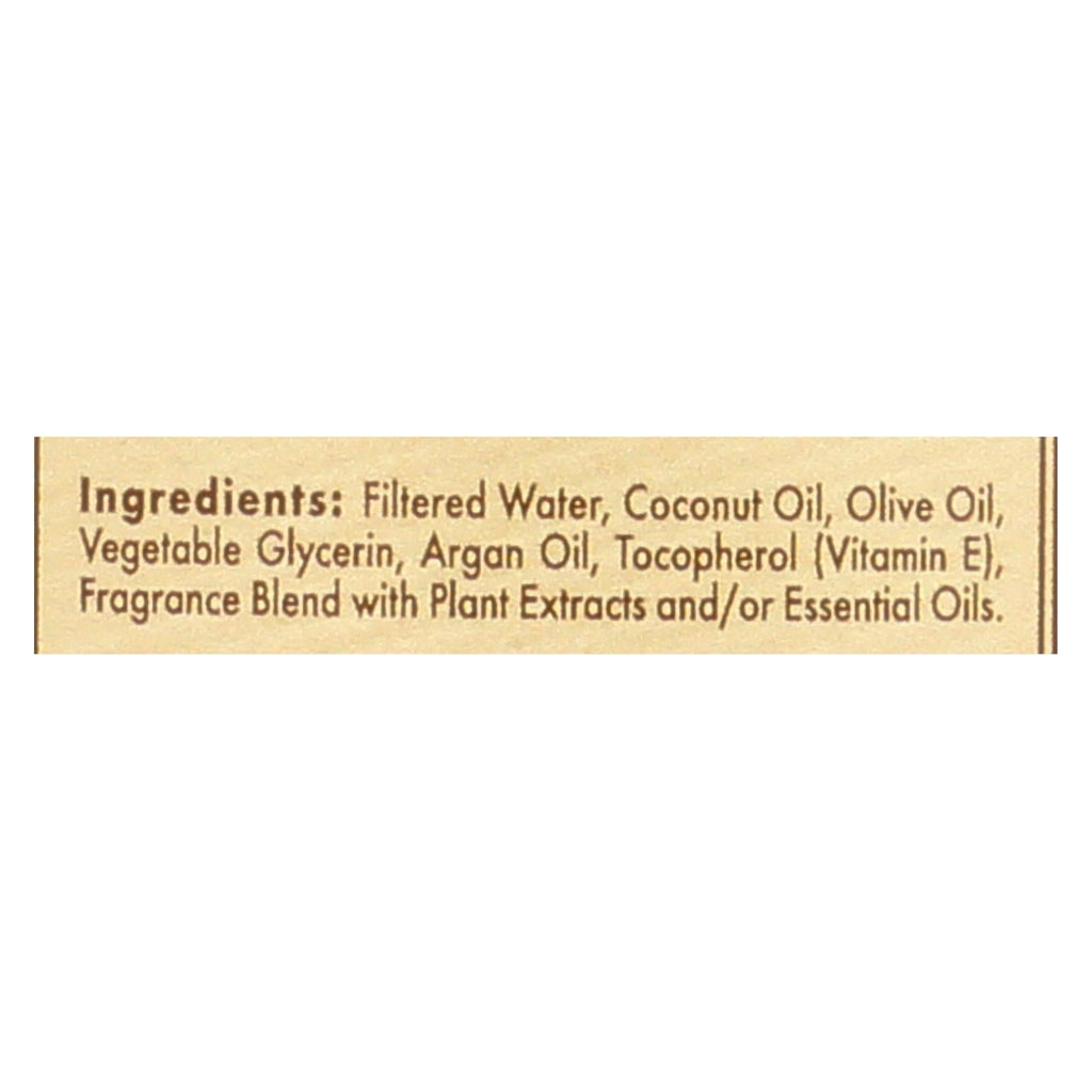 Ingredientes: agua filtrada, aceite de coco, aceite de oliva, glicerina vegetal, aceite de argán, tocoferol, vitamina E, mezcla de fragancias con extractos de plantas y/o aceites esenciales.