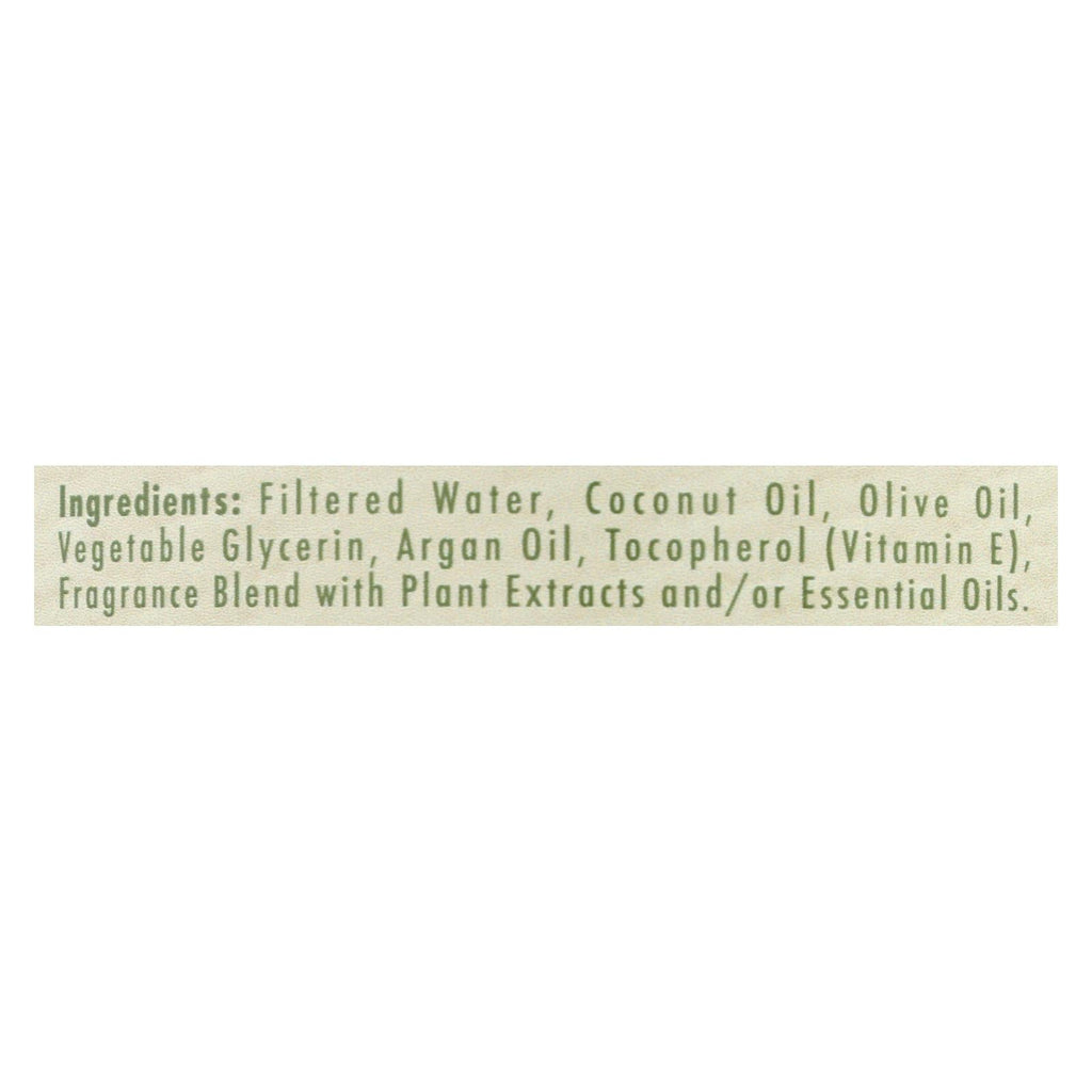Ingredientes: agua filtrada, aceite de coco, aceite de oliva, glicerina vegetal, aceite de argán, tocoferol, vitamina E, mezcla de fragancias con extractos de plantas y/o aceites esenciales.