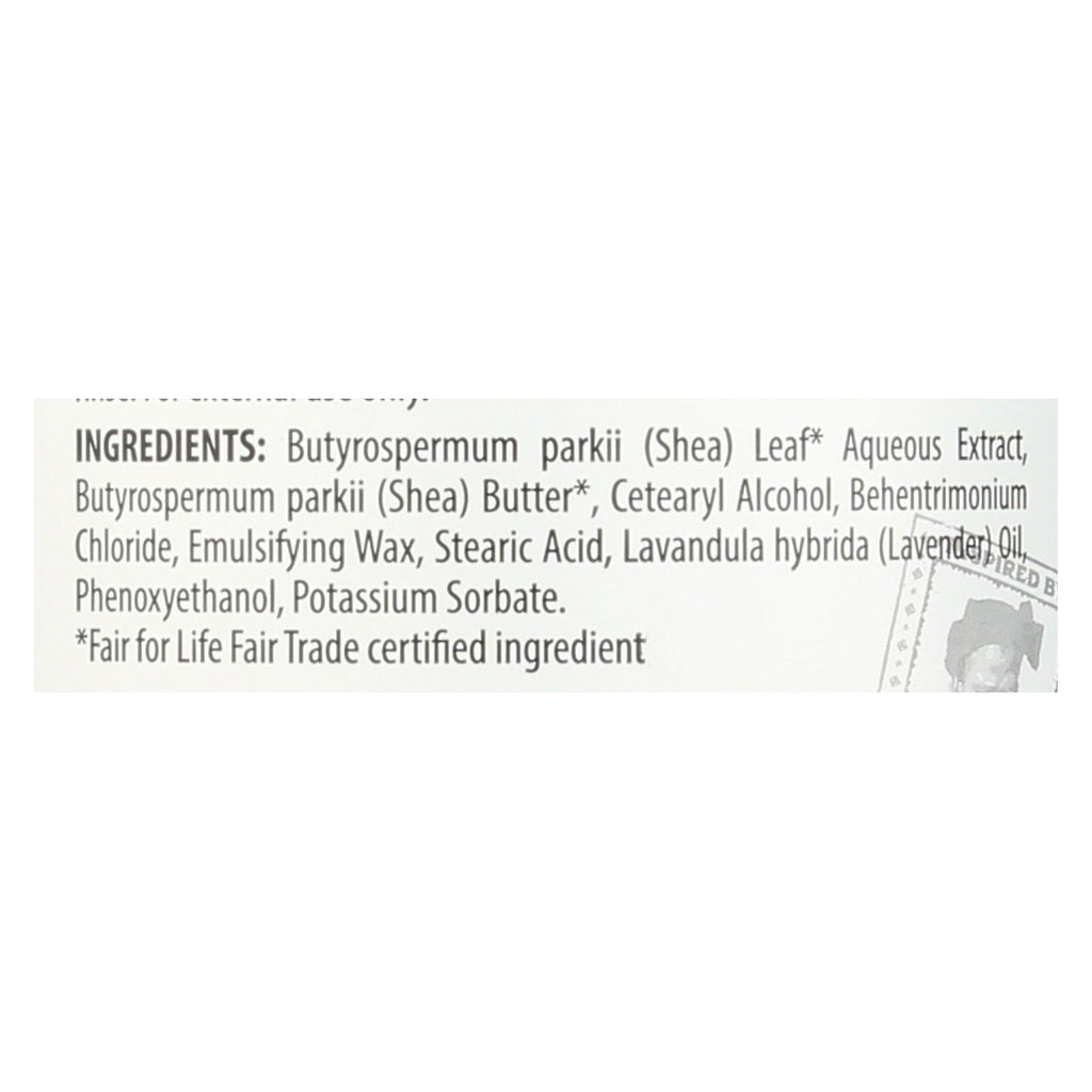 Ingredientes: extracto acuoso de hoja de Butyrospermum parkii, karité, alcohol cetearílico, mantequilla, cloruro de behentrimonio, cera emulsionante, ácido esteárico, aceite de Lavandula hybrida, lavanda, fenoxietanol, sorbato de potasio.