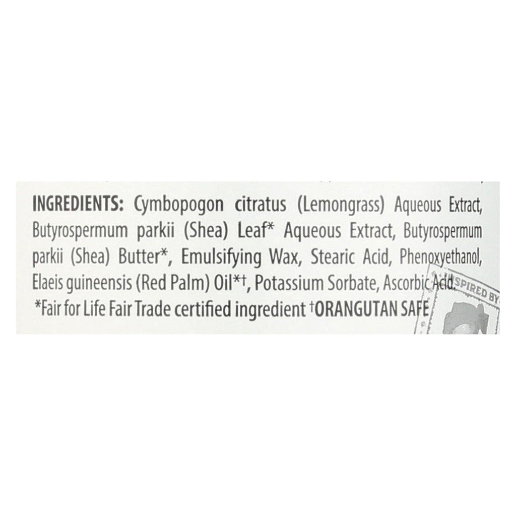 Ingredientes: Cymbopogon citratus; limoncillo; extracto acuoso; butyrospermum parkii; karité; extracto acuoso de hoja; mantequilla; cera emulsionante; ácido esteárico; fenoxietanol; elaeis guineensis; aceite de palma roja†; sorbato de potasio; ácido ascórbico.