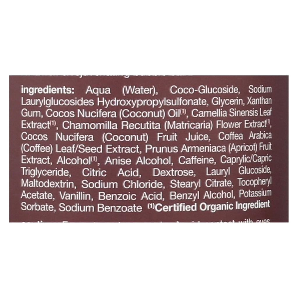 Ingredientes: agua, coco glucósido, lauril glucósido hidroxipropilsulfonato de sodio, glicerina, goma xantana, coco nucifera, aceite de coco, extracto de hoja de Camellia sinensis, extracto de flor de Chamomilla recutita, matricaria, zumo de fruta, Coffea arabica, extracto de hoja/semilla de café, Prunus armeniaca, extracto de fruta de albaricoque, alcohol, alcohol de anís, cafeína, triglicérido caprílico/cáprico, ácido cítrico, dextrosa, lauril glucósido, maltodextrina, cloruro de sodio, citrato de estearilo, acetato de tocoferilo, vainillina, ácido benzoico, alcohol bencílico, potasio.