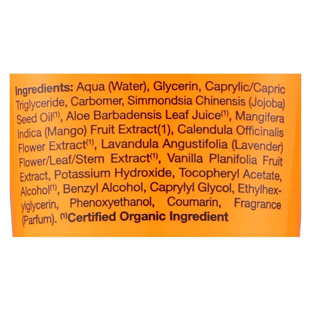 Ingredientes: agua, glicerina, triglicérido caprílico/cáprico, carbómero, aceite de semilla de Simmondsia chinensis, jojoba¹, zumo de hoja de Aloe barbadensis, extracto de fruta de Mangifera indica, extracto de mango, extracto de flor de Calendula officinalis¹, extracto de Lavandula angustifolia, extracto de flor/hoja/tallo de Lavanda, extracto de fruta de Vanilla planifolia, hidróxido de potasio, acetato de tocoferilo, alcohol, alcohol bencílico, caprilil glicol, etilhexilglicerina, fenoxietanol, cumarina, fragancia.
