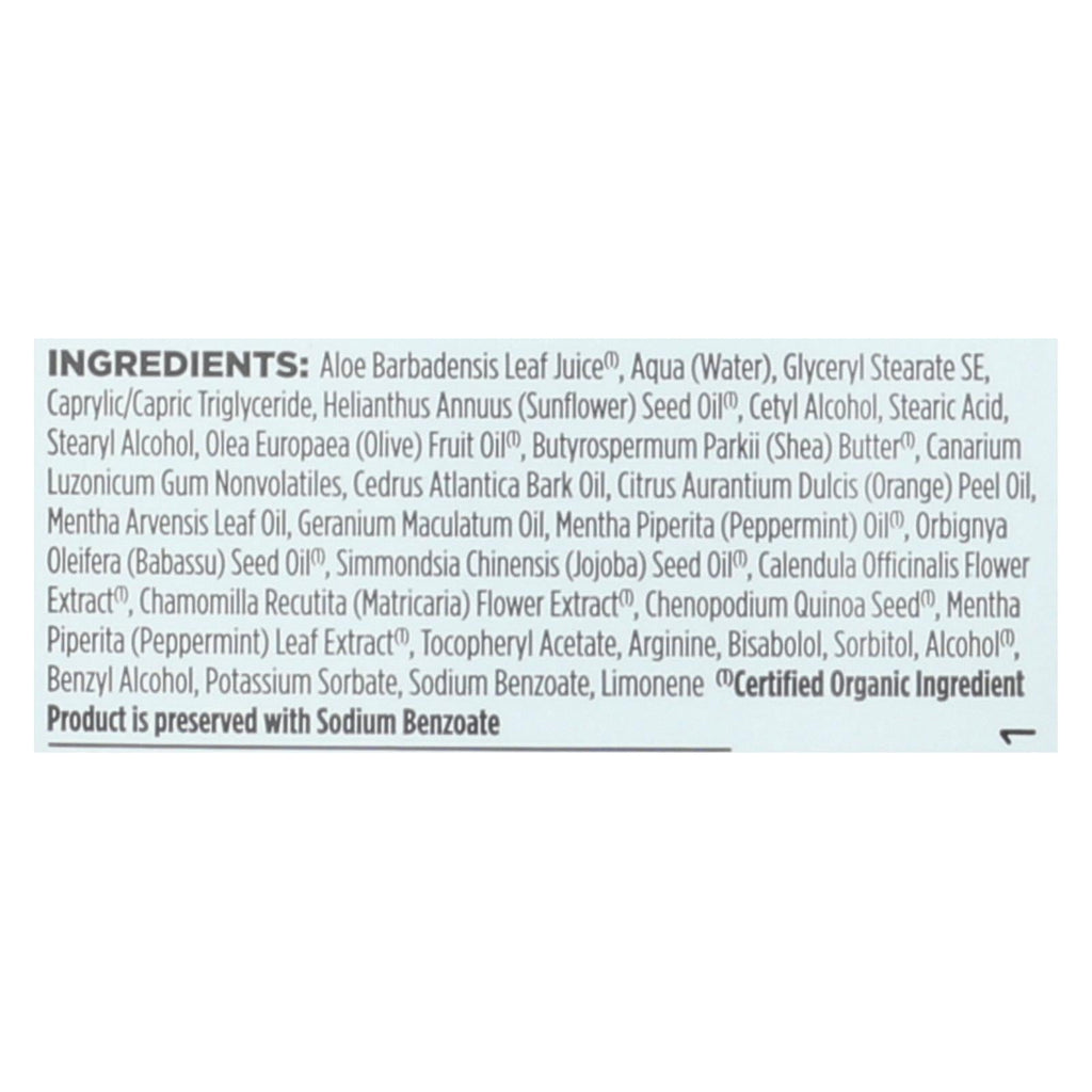 ingredientes: jugo de hoja de aloe barbadensis;¹;aqua;agua;estearato de glicerilo se. Triglicérido caprílico/cáprico. Helianthus annuus;girasol;aceite de semilla;alcohol cetílico;agregado esteárico;alcohol estearílico;olea europaea;oliva;aceite de fruta;butyrospermum parkii;karité;manteca;goma canarium luzonicum no volátiles. Aceite de corteza de Cedrus atlantica; aceite de cáscara de naranja; aceite de tetina de mentha arvensis. Aceite de geranio maculatum. Mentha piperita;menta;aceite;orbignya oleilera;babassu;simmondsia chinensis;jojoba;calendula officinalis flowe
