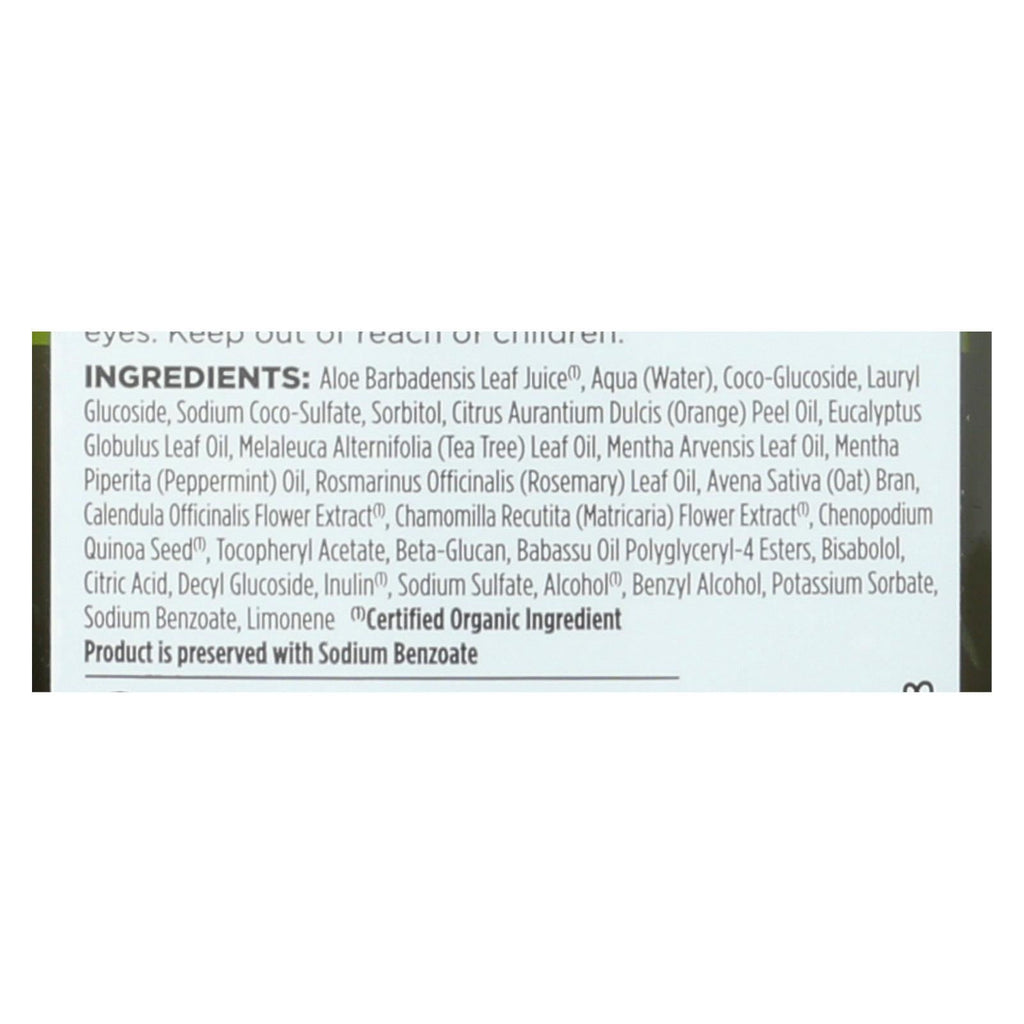 Ingredientes: jugo de hoja de aloe barbadensis;¹; agua; coco-glucósido; lauril glucósido; coco-sulfato de sodio; sorbitol; aceite de cáscara de Citrus aurantium dulcis; aceite de cáscara de naranja; aceite de hoja de Eucalyptus globulus; Melaleuca alternifolia; aceite de hoja de árbol de té; aceite de hoja de Mentha arvensis; Mentha piperita; aceite de menta; Rosmarinus officinalis; romero; Avena sativa; salvado de avena; extracto de flor de Calendula officinalis; extracto de flor de Chamomilla recutita; manzanilla; semilla de Chenopodium quinoa; acetato de tocoferilo; beta-glucano; ésteres de poligliceril-4 de aceite de babasú; bisabo