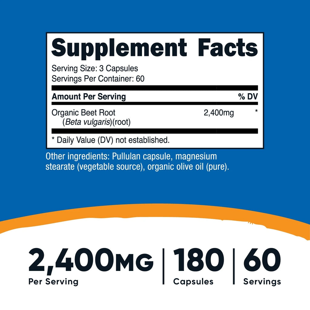 Polvo de raíz de remolacha orgánica (Beta vulgaris) (raíz), cápsula de pululano, estearato de magnesio (fuente vegetal), aceite de oliva orgánico.