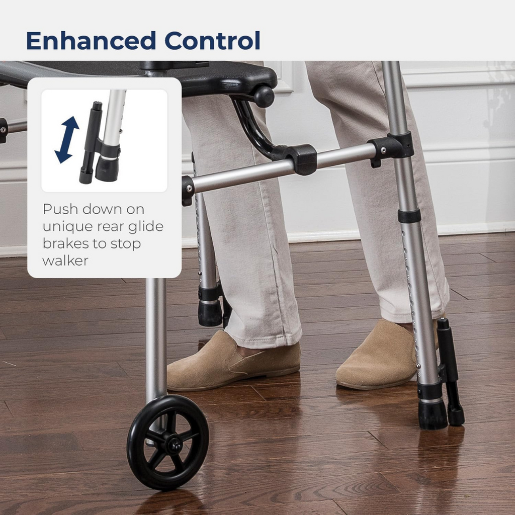Answer: Standard walkers have no wheels and offer maximum stability. Two wheel walkers roll more easily for continuous steps. Wheel diameter and glide tips affect indoor and outdoor use. See the product page for details.