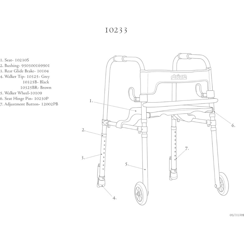 Answer: Inspect rubber tips wheels and glide caps for wear. Replace as needed. Common accessories include trays pouches tennis ball style glides and tip replacements. Use only compatible parts listed on the product page.