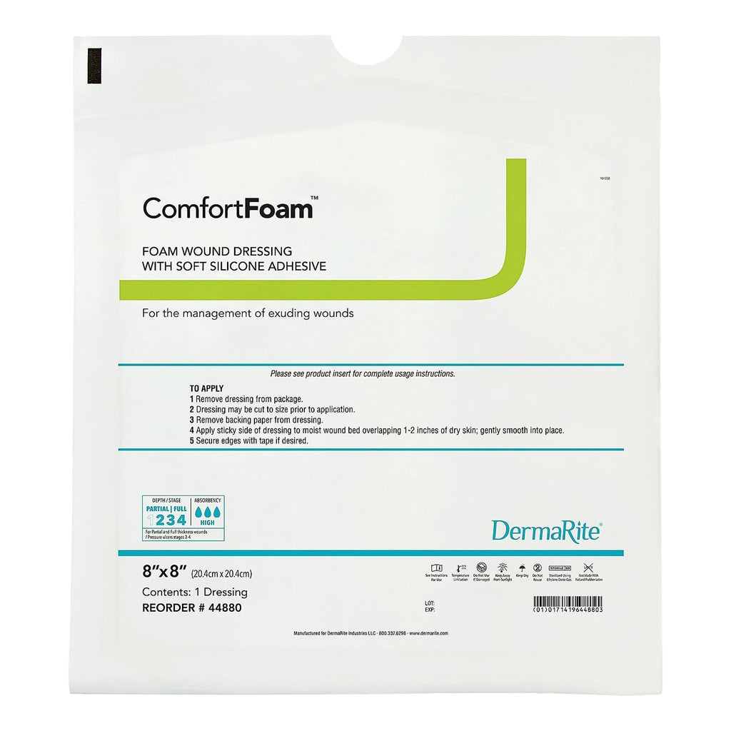• ComfortFoam es un apósito de espuma de silicona autoadhesivo que consta de una capa de contacto de silicona suave, una almohadilla de espuma de poliuretano absorbente y flexible y una película exterior permeable al vapor y a prueba de humedad.
