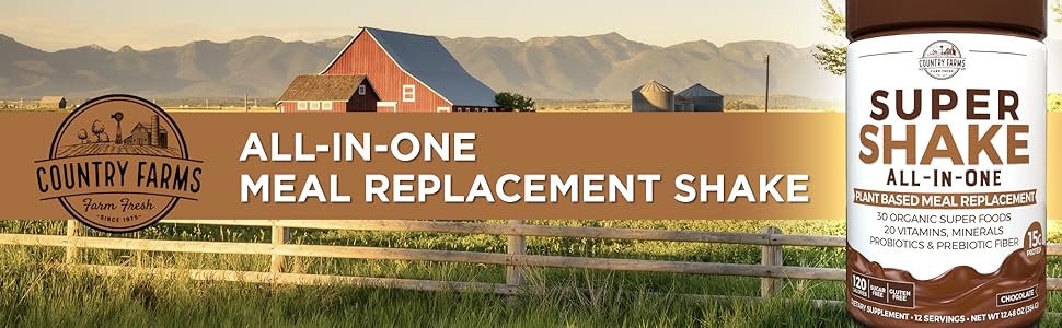 Todo en uno. Mezcla de superalimentos. Fresco de granja desde 1975. Mezcla de superalimentos. El batido todo en uno Country Farms está formulado con una mezcla equilibrada de proteínas de calabaza, chía y guisante. Cada porción sin gluten contiene 15 gramos de proteína, esencial para personas activas. La fórmula todo en uno también incluye vitaminas, minerales, antioxidantes y una mezcla de superalimentos. Disfrute de la comodidad de una proteína en polvo nutricional todo en uno con alimentos verdes como parte de un estilo de vida saludable. Listo para usar: leche, agua, yogur, recetas. Proteger del calor, la luz y la humedad. Se vende por peso, no por volumen. Puede haberse asentado.