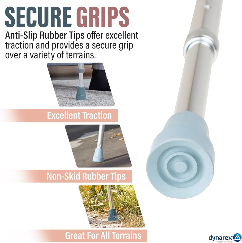 Answer: Crutches are typically aluminum for light weight or wood for durability. Non slip rubber tips should sit flat on the floor and include metal reinforcement. Replace tips when tread is worn or the base feels soft.