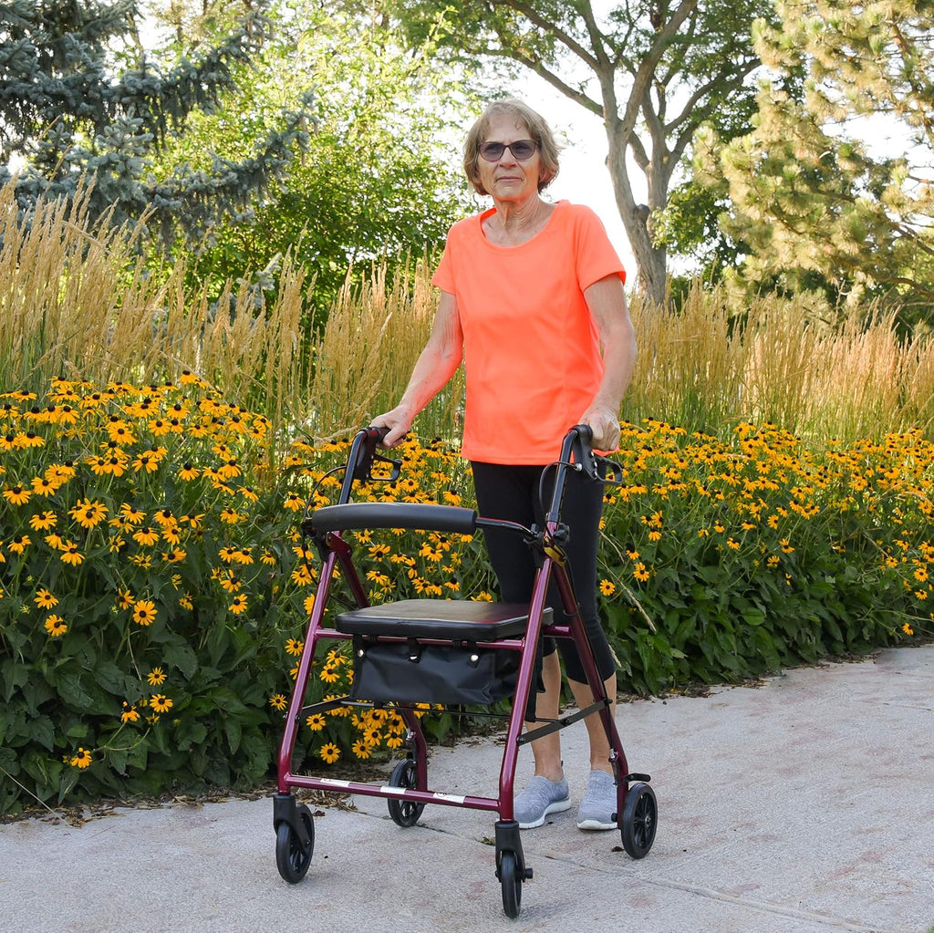 Question: What are the seat size and sitting features of ProBasics Deluxe Aluminium Rollator For Seniors and Elders, Wheel size 8inch With Height Adjustable,Weight Capacity 300lbs,Burgundy Flame Color, RLA8BGF?