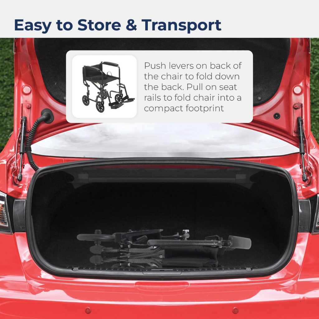 ADVERTENCIA: Este producto puede exponerlo a sustancias químicas que el estado de California reconoce como causantes de cáncer, defectos congénitos u otros daños reproductivos. Para obtener más información, visite www.p65Warnings.ca.gov . Silla de transporte con asiento de 17 pulgadas de ancho y reposapiés abatible de longitud completa con marco de acero y acabado con veta plateada.