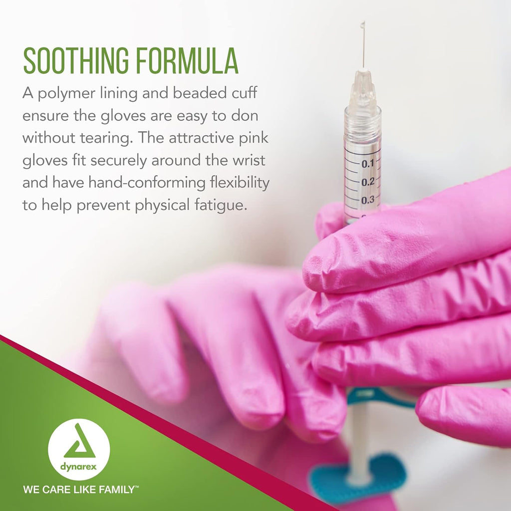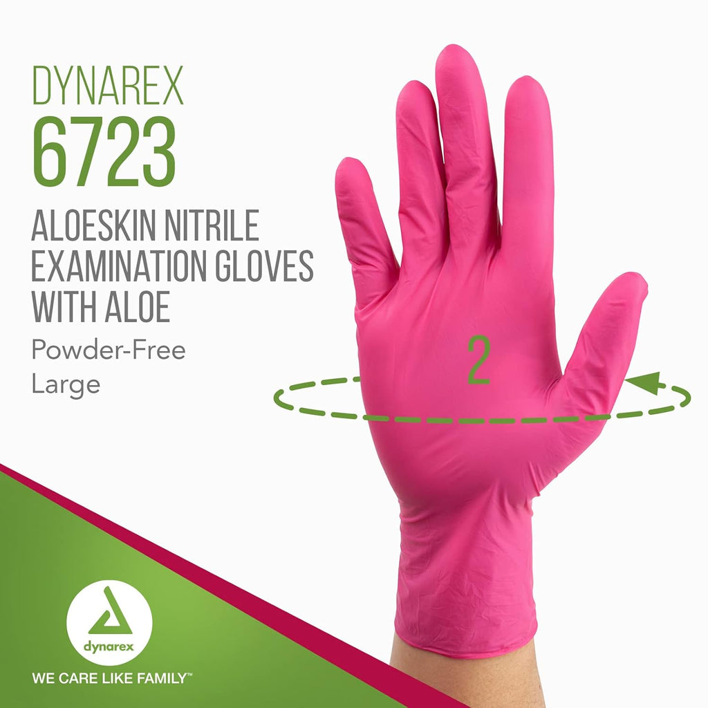 Los guantes de examen de nitrilo Dynarex AloeSkin son de nitrilo de primera calidad y sin polvo, confeccionados para una protección y comodidad óptimas. Para nutrir la piel, estos guantes están impregnados con aloe vera y vitamina E. Estos guantes ambidiestros de color magenta están diseñados con puntas texturizadas para un mejor agarre y un grosor mínimo de 2 milésimas de pulgada en las puntas de los dedos y las palmas para una mayor sensibilidad táctil. Estos guantes de examen cuentan con un forro de polímero para una mayor resistencia a las perforaciones y puños con reborde para facilitar su colocación. Los guantes se ajustan firmemente a la muñeca y se adaptan a la mano para prevenir la fatiga física. Ideales para una amplia gama de centros sanitarios y entornos profesionales.