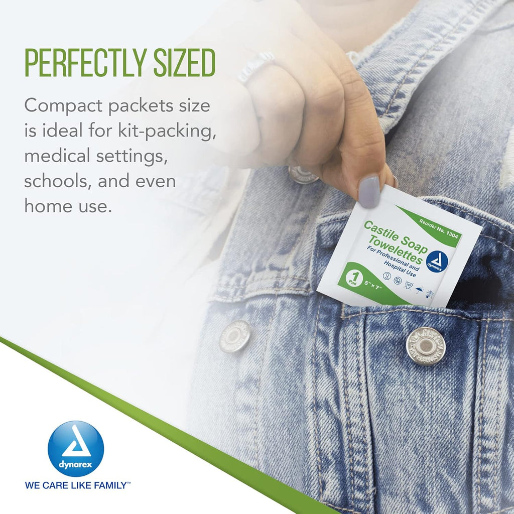 Las toallitas de jabón de Castilla Dynarex son suaves y sin alcohol, con una solución jabonosa a base de aceite de coco con pH equilibrado para una limpieza suave. Estas toallitas están diseñadas para su uso en procedimientos de recolección de orina limpia durante el miocardio. Son desechables y vienen envueltas individualmente, con el tamaño ideal para botiquines de primeros auxilios, consultorios médicos, escuelas, uso doméstico y otros entornos.