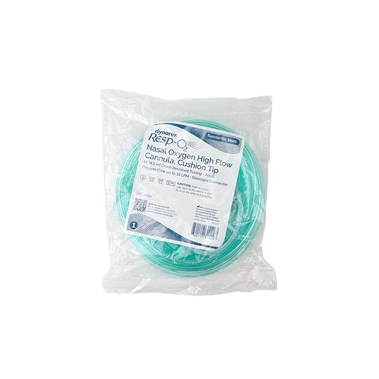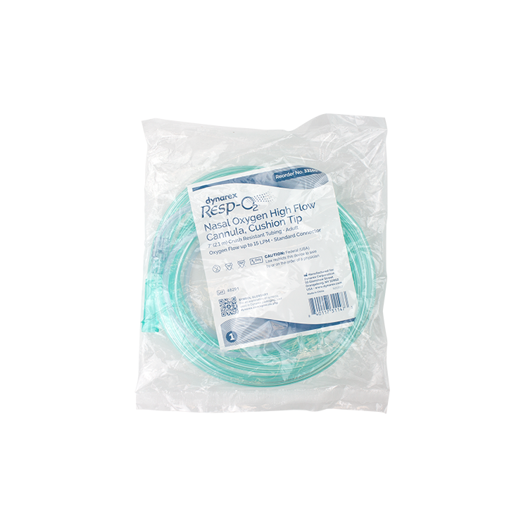 Las cánulas nasales de oxígeno de alto flujo Dynarex Resp-O2 están diseñadas para administrar oxígeno suplementario a altas tasas de flujo a pacientes con dificultad respiratoria. Las cánulas incluyen conectores estándar y un tubo de suministro de oxígeno verde claro, diseñado para mejorar la visibilidad del tubo.