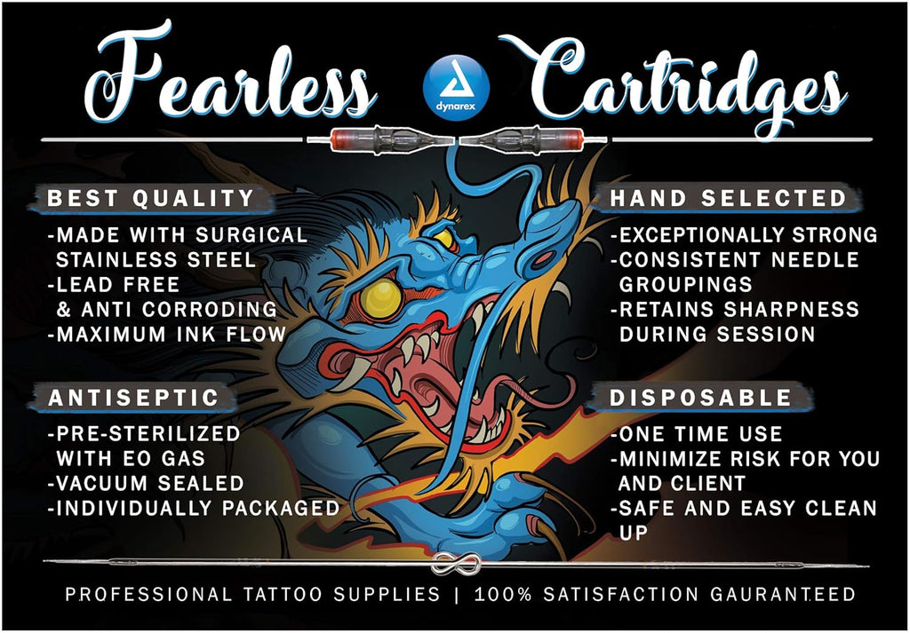 Los cartuchos de tatuaje Dynarex Fearless están fabricados con agujas de acero inoxidable de grado quirúrgico para un trabajo técnico detallado y líneas precisas. La punta fina de cada aguja está diseñada para mayor comodidad del cliente durante el proceso de tatuaje. Los cartuchos Fearless cuentan con un sistema de membrana de seguridad que evita el reflujo de tinta y la entrada de otros contaminantes en la carcasa de plástico, la empuñadura del cartucho y las máquinas rotativas o de bobina. El cuerpo transparente de cada cartucho permite una mejor visibilidad del trabajo de la aguja durante el tatuaje, garantizando así la precisión del diseño. La línea de cartuchos Fearless incluye una variedad de delineadores redondos y delineadores redondos ajustados.