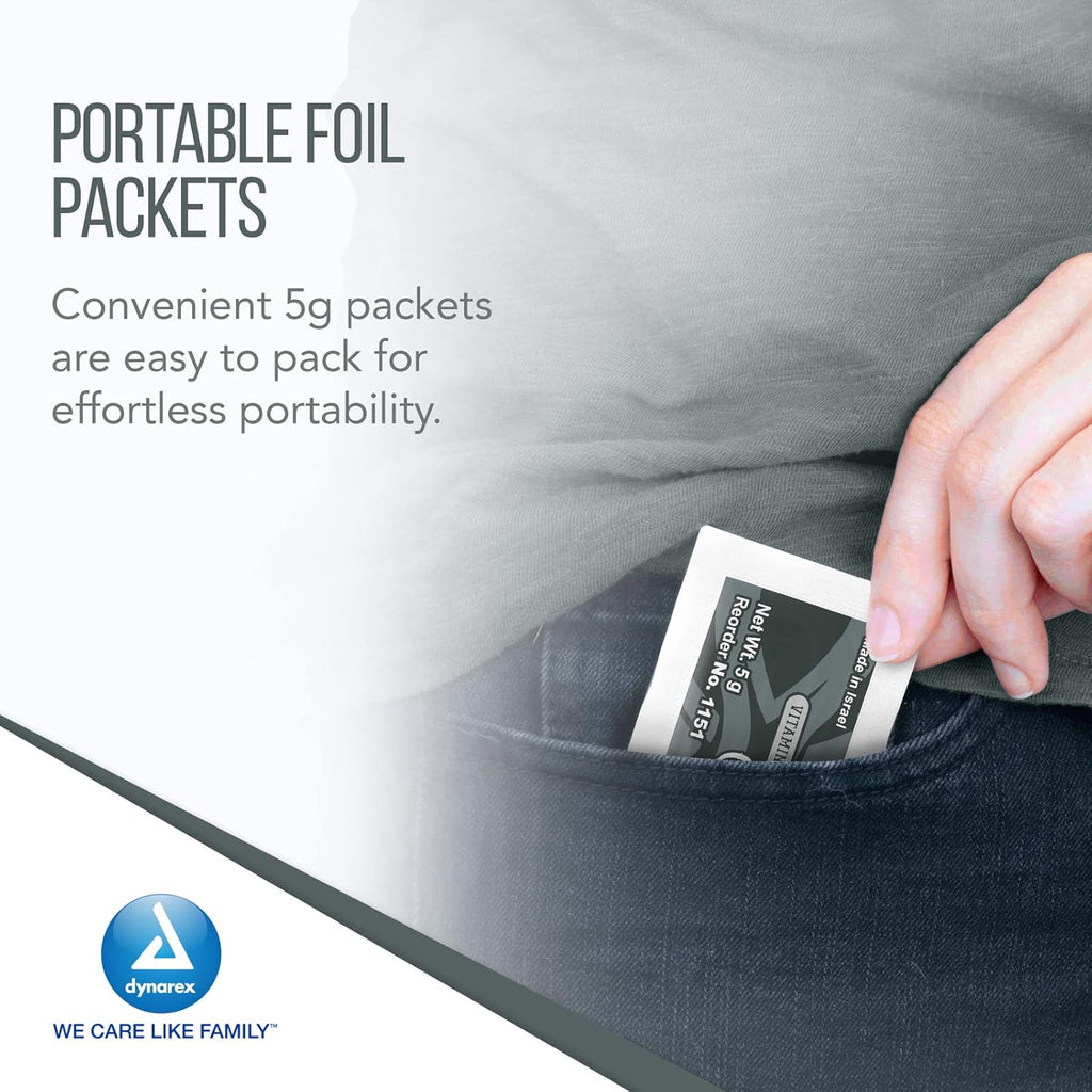 • Los prácticos paquetes de 5 g son fáciles de empacar para transportarlos sin esfuerzo.