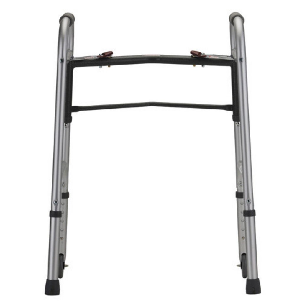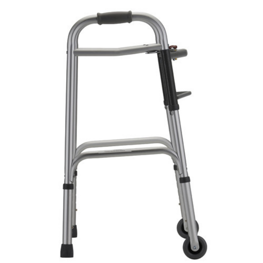 Answer: Most walkers fold flat using side buttons or levers. Check the overall width when open and folded. Compare with your doorway and storage space measurements listed under Specifications.