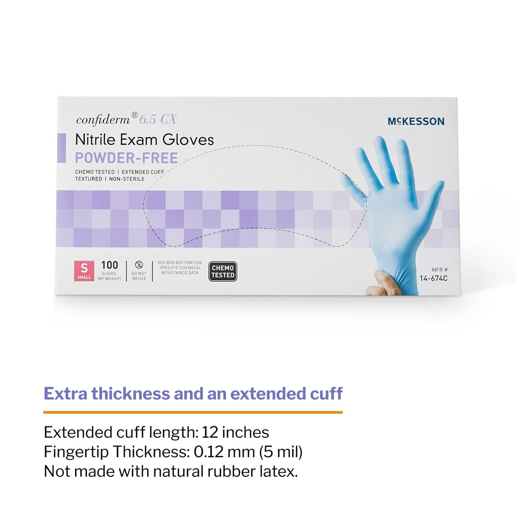 Question: What sizes and fit options are available for Exam Glove McKesson Confiderm 6.5CX Small NonSterile Nitrile Extended Cuff Length Textured Fingertips Blue Chemo Tested?