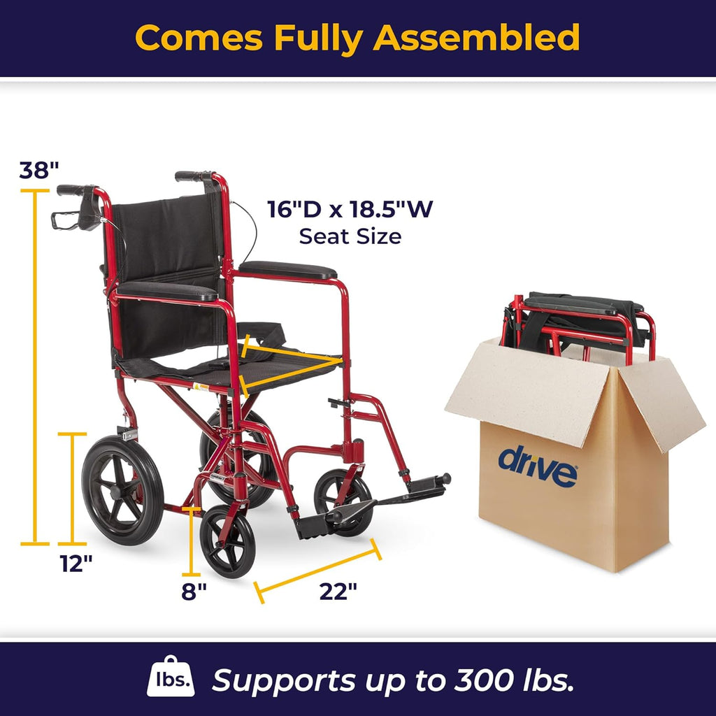 Peso ligero: solo 8,6 kg, pero tiene una capacidad de peso de 136 kg. ¡El único en el mercado! La práctica palanca en el respaldo facilita el plegado. Se pliega para facilitar el transporte. Los usuarios con fuerza o destreza limitadas en la parte superior del cuerpo apreciarán su facilidad de uso y manejo. El marco de aluminio con recubrimiento en polvo es ligero y duradero, y está disponible en azul y rojo. El asiento está hecho de tapicería de nailon ligera y duradera, e incluye cinturón de seguridad y frenos de mano para mayor seguridad. Bloqueos de ruedas activados por el acompañante. Las 12 ruedas traseras antipinchazos proporcionan una conducción más estable en diversos terrenos, además de facilitar el paso por umbrales y bordillos. Las ruedas negras de composite prácticamente no requieren mantenimiento e incorporan una superficie antirayaduras. Viene ensamblada. Simplemente ábrala, levante el respaldo y coloque el reposapiés. Garantía limitada de por vida.