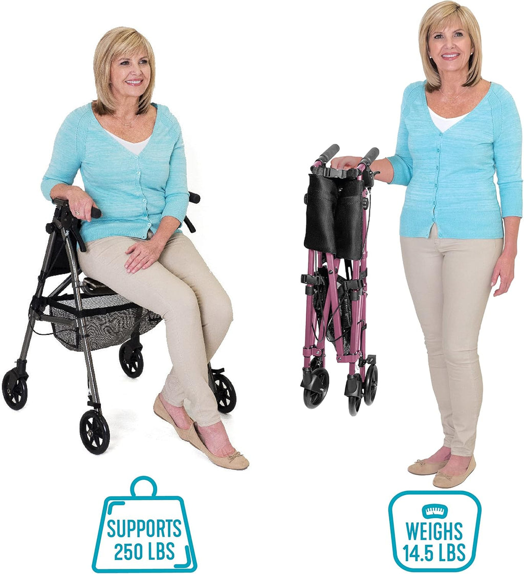 El Wonder Rollator Plus se pliega tres veces más pequeño que un andador promedio. Este andador ligero pesa solo 6.7 kg y se pliega en un tamaño compacto de 25.4 cm x 28.9 cm, ideal para llevar de vacaciones o para hacer recados en la tienda.