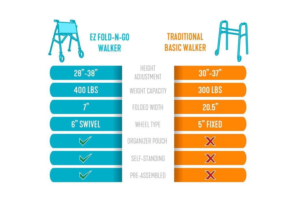 El andador EZ Fold-N-Go se pliega hasta un tamaño cuatro veces menor que un andador promedio. Este andador ligero pesa solo 3.6 kg y se pliega hasta ocupar un espacio compacto de 13 x 18 cm, ideal para llevarlo de vacaciones o para hacer recados en la tienda.