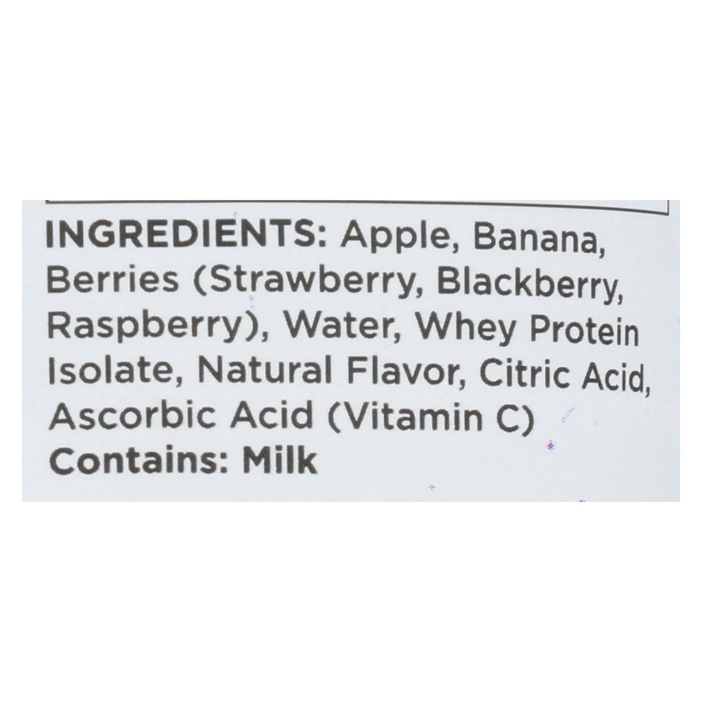 Ingredientes: manzana, plátano, fresa, agua, aislado de proteína de suero, frambuesa, mora, sabor natural, ácido cítrico y ácido ascórbico (para mantener la frescura).