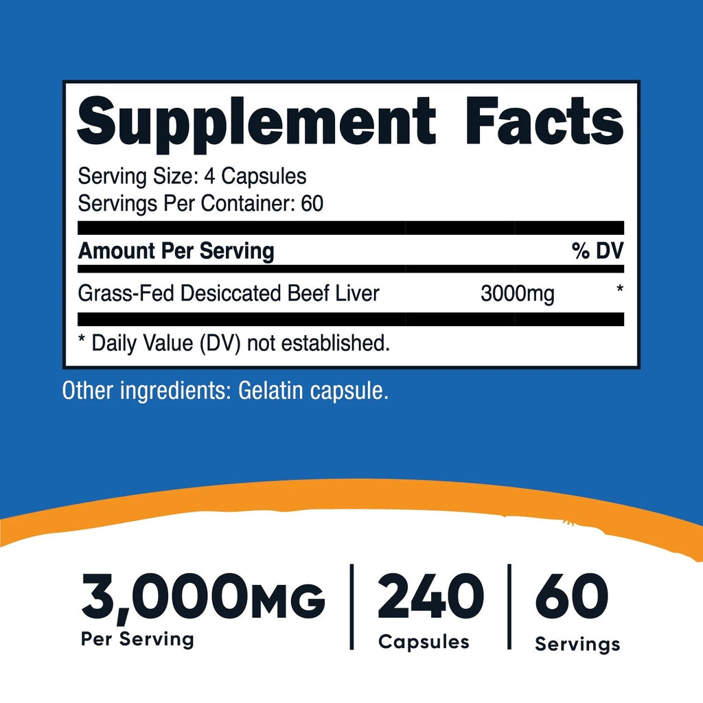 El hígado de res desecado de Nutricost proviene de vacas argentinas alimentadas con pasto, criadas en libertad, sin OMG ni hormonas añadidas. Cada cápsula contiene 750 mg, lo que equivale a una porción de 4 cápsulas de 3000 mg. Cada frasco contiene 240 cápsulas (60 porciones). Nutricost, con sede en EE. UU., utiliza únicamente los mejores ingredientes para garantizar la máxima calidad y ayudarte a sentirte de maravilla. Al mantener las recetas de nuestros suplementos simples y claras, obtienes la mejor experiencia posible con Nutricost. Nuestros suplementos se fabrican en instalaciones que cumplen con las buenas prácticas de fabricación (GMP) y están registradas por la FDA; y cada lote de cada producto es analizado por laboratorios independientes con certificación ISO.