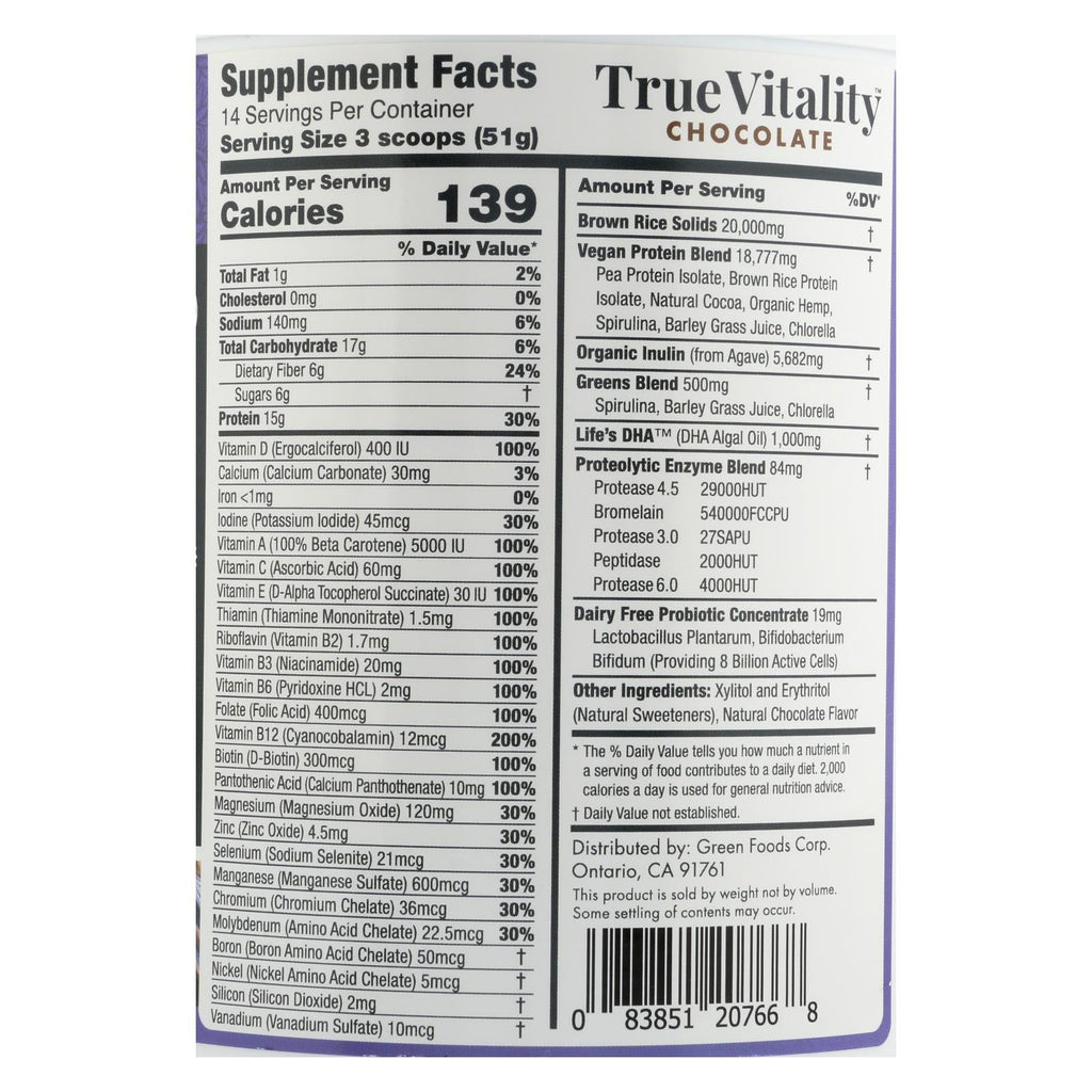 Batido de proteína vegetal True Vitality con DHA y chocolate de Green Foods. Descripción: Nutrición completa y equilibrada para estilos de vida activos. Contiene probióticos / 8 mil millones de células activas. Vegano / sin gluten / sin lácteos / sin soya. Aporta vitaminas y minerales esenciales. Formulado con enzimas y probióticos. Contiene omega 3 y fibra orgánica. Sin colorantes ni saborizantes artificiales. Life's DHA: cerebro, ojos y corazón saludables. Completo, natural y sinérgico. True Vitality es un batido de proteína vegetal completo y natural con DHA, formulado para personas con estilos de vida activos. Diseñado como una comida integral, contiene proteína vegetariana, omega 3, probióticos, enzimas, carbohidratos, vegetales, fibra y el 100 % de la dosis diaria recomendada de vitaminas esenciales. Los ingredientes fueron formulados científicamente para actuar sinérgicamente y mejorar la digestión de las proteínas, promover una flora digestiva saludable y apoyar el funcionamiento del cerebro, los ojos, el corazón y el sistema nervioso. Personas con vidas ocupadas, personas interesadas en perder peso y deportistas se beneficiarán de este batido práctico, nutritivo y sabroso. Digestión completa de proteínas: las proteínas presentes en True Vitality son todas de origen vegetal y se derivan de guisantes, arroz, cáñamo, espirulina, clorella y jugo de hierba de cebada. La mezcla de enzimas proteolíticas está específicamente diseñada para ayudar a descomponer estas proteínas vegetales. Los cinco tipos diferentes de enzimas ayudan a reducir la carga digestiva impuesta al cuerpo por la suplementación proteica, a la vez que proporcionan la máxima disponibilidad de nutrientes para la recuperación y reconstrucción muscular. Promueve una flora digestiva saludable: True Vitality contiene una mezcla de prebióticos y probióticos que actúan sinérgicamente para mantener una flora saludable en todo el tracto digestivo. La inulina orgánica prebiótica facilita el tránsito intestinal y es especialmente eficaz para quienes padecen dolencias comunes causadas por un tracto digestivo lento. Además, la inulina orgánica puede ayudar a mantener niveles saludables de colesterol y glucosa en sangre. La inulina orgánica tiene un índice glucémico muy bajo, lo que la hace adecuada para personas con dietas restrictivas. Los 8 mil millones de células probióticas activas (Lactobacillus plantarum y Bifidobacterium bifidum) también favorecen la digestión al mantener una flora intestinal sana y beneficiosa, principalmente en el intestino delgado. La suplementación con probióticos ayuda a combatir un entorno hostil para los microorganismos dañinos, además de favorecer la síntesis de vitaminas, mejorar la inmunidad y promover niveles saludables de pH en el tracto digestivo. Omega 3: esencial para cada etapa de la vida. Life's DHA es una fuente vegetariana de ácido graso omega 3 (DHA) (ácido docosahexaenoico), ideal para todas las edades. El DHA es recomendado por la Asociación Americana del Corazón y las directrices dietéticas del USDA para una buena salud cardiovascular. Además, favorece el desarrollo y el funcionamiento del cerebro, los ojos y el sistema nervioso. Life's DHA no tiene el sabor ni el olor desagradables asociados con el aceite de pescado, ni los diversos contaminantes que a veces se encuentran en los aceites de pescado. No contiene sal añadida, colorantes, rellenos ni conservantes, productos animales, gluten, soja, trigo ni levadura. Aviso legal: Estas declaraciones no han sido evaluadas por la FDA. Estos productos no están destinados a diagnosticar, tratar, curar o prevenir ninguna enfermedad.