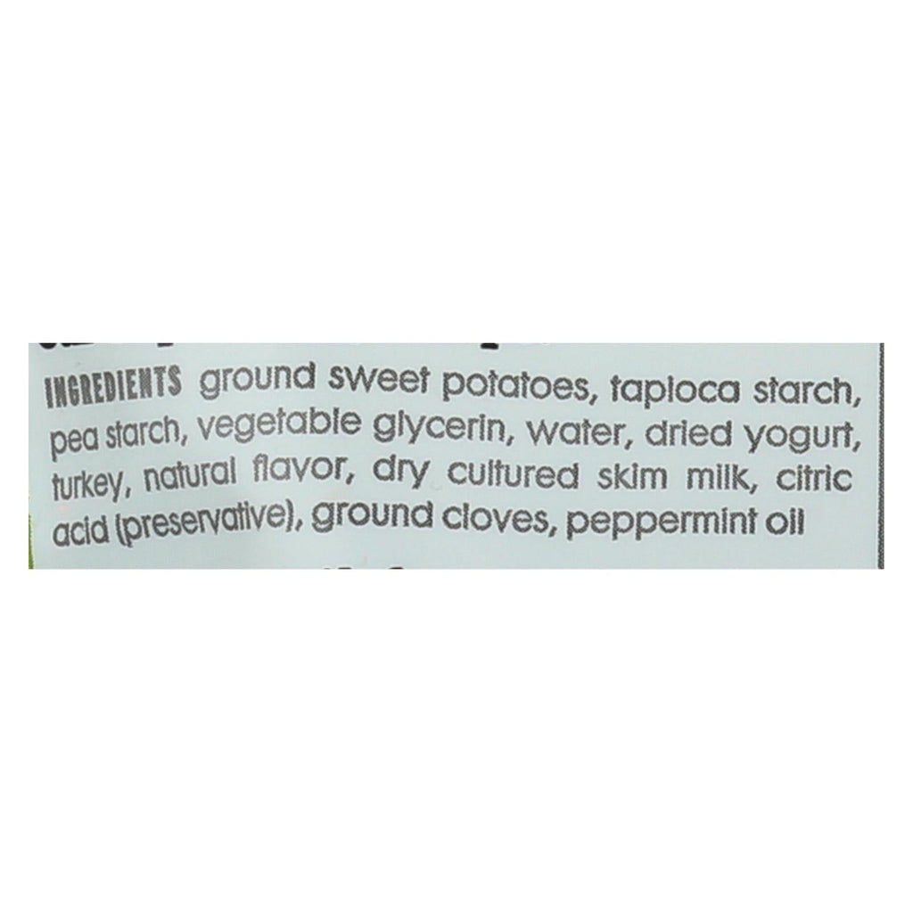 Ingredientes: batata, almidón de tapioca, almidón de guisantes, glicerina vegetal, agua, yogur deshidratado, pavo, saborizante natural, leche desnatada deshidratada, ácido cítrico, conservante, clavo de olor, aceite de menta.