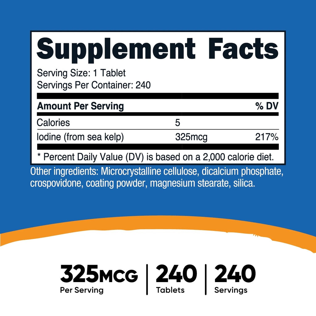 Cada frasco de Nutricost Yodo contiene 240 tabletas de yodo natural (de algas marinas). Cada frasco contiene 240 porciones (1 tableta por porción). Cada tableta contiene 325 mcg de yodo. Nutricost, con sede en EE. UU., utiliza únicamente los mejores ingredientes para garantizar la máxima calidad y ayudarte a sentirte de maravilla. Al mantener las recetas de nuestros suplementos simples y claras, obtienes la mejor experiencia posible con Nutricost. Nuestros suplementos se fabrican en instalaciones que cumplen con las buenas prácticas de fabricación (GMP) y están registradas por la FDA; y cada lote de cada producto es analizado por laboratorios independientes con certificación ISO.