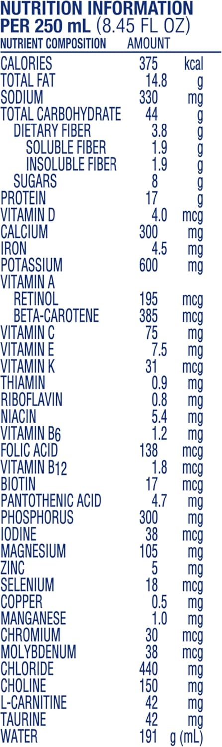 Ingredientes: Agua, jarabe de glucosa, aceite de canola, concentrado de proteína de leche, aislado de proteína de soja y menos del 2% de fibra de guisante, fructooligosacáridos, citrato de sodio, citrato de potasio, inulina (de achicoria), fosfato de calcio, cloruro de potasio, maltodextrina, fosfato de magnesio, lecitina de soja, sal, ascorbato de sodio, cloruro de colina, citrato de calcio, L-carnitina, taurina, carragenina, óxido de magnesio, acetato de DL-alfa tocoferilo, sulfato de zinc, sulfato ferroso, niacinamida, pantotenato de calcio, sulfato de manganeso, piridoxina. CLORHIDRATO, CLORHIDRATO DE TIAMINA, SULFATO DE COBRE, RIBOFLAVINA, BETACAROTENO, PALMITATO DE VITAMINA A, ÁCIDO FÓLICO, CLORURO DE CROMO, YODURO DE POTASIO, MOLIBDATO DE SODIO, SELENITO DE SODIO, VITAMINA K1, BIOTINA, VITAMINA D3, VITAMINA B12