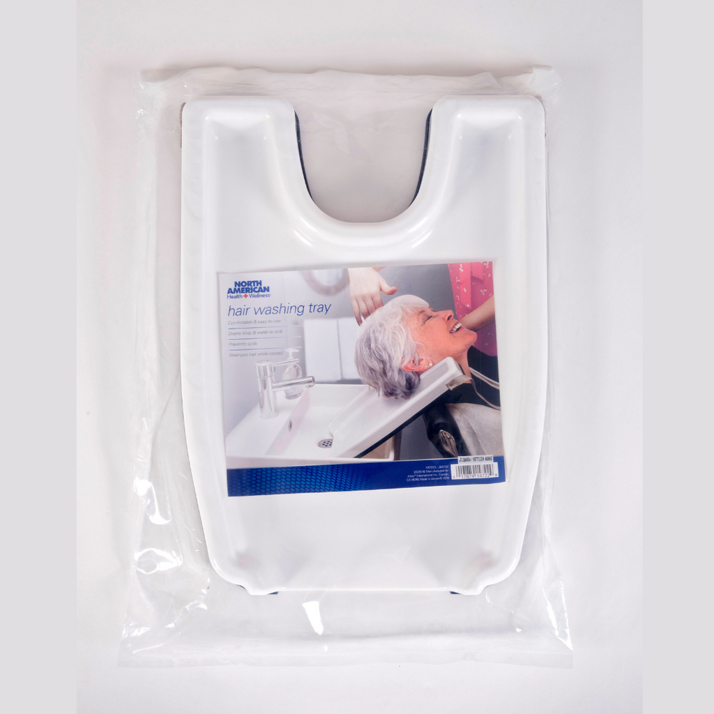 • La bandeja para lavar el cabello, fácil de usar, está contorneada para adaptarse cómodamente al cuello y descansar sobre los hombros del usuario para facilitar el lavado con champú en una posición sentada.