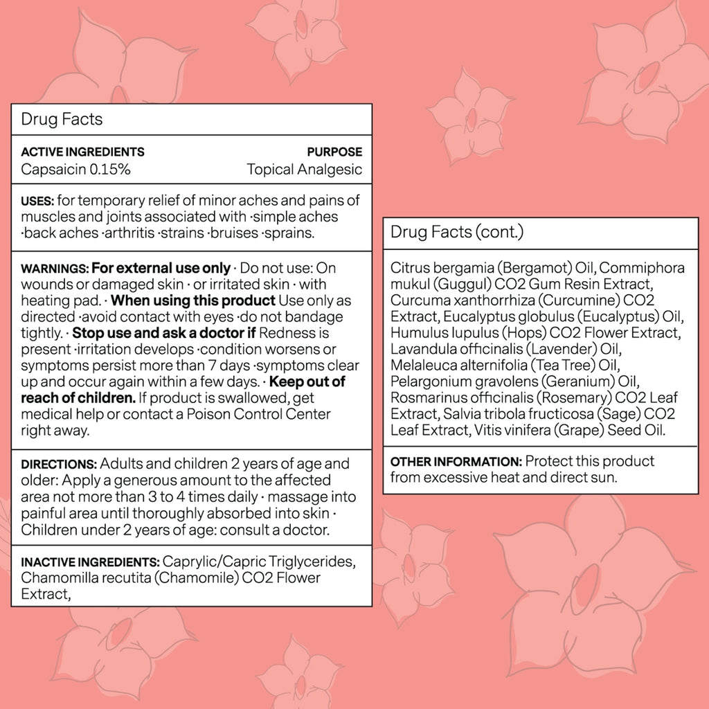 • Enriquecido con una mezcla de aceites naturales calmantes, que incluyen geranio, manzanilla, bergamota, eucalipto, árbol de té y salvia, el aceite de capsaicina tópico calienta y alivia el dolor instantáneamente.