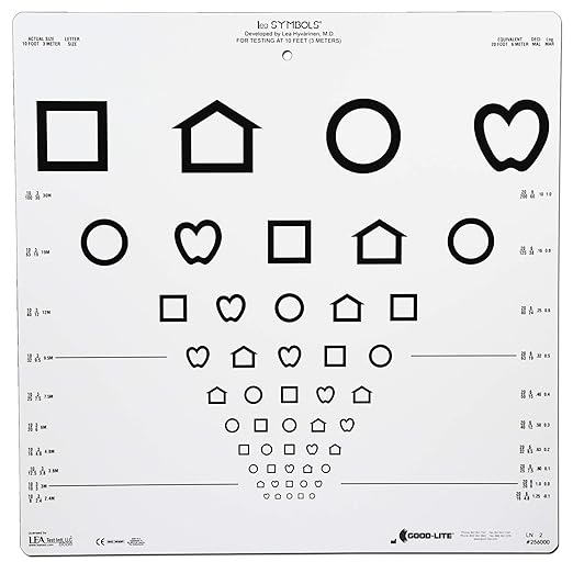 Tabla de visión pediátrica con SÍMBOLOS LEA para la evaluación de niños de 2 años y medio a 4 años. Líneas con espaciado proporcional; el tamaño de las líneas varía de 20/200 a 20/16 (de 6/60 a 6/4.8). Se han omitido las líneas de 20/160 (6/48) y 20/100 (6/30). Rectángulo con espaciado del 50% (formato de la Prueba de Agudeza Visual de Massachusetts) con tamaños de línea de 20/80 a 20/16 (de 6/24 a 6/4.8). Incluye un orificio para colgar la tabla en la pared. Incluye clave de respuestas e instrucciones. 40,6 cm x 40,6 cm (16" x 16"). Las anotaciones incluyen el tamaño real de la letra para medidas de 10 pies y 3 metros, que se encuentran en el lado izquierdo de la tabla. Las notaciones de tamaños de letras equivalentes incluyen medidas de 20 pies, 6 metros, decimales y Log MAR, que se encuentran en el lado derecho de la tabla. Distancia de prueba de 10 pies, 3 metros.