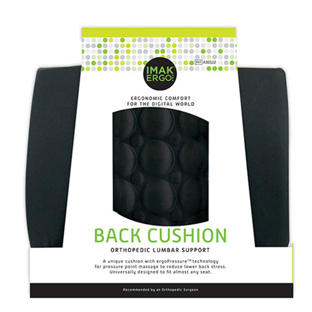 Answer: Lumbar Support Cushion IMAK Ergo Back Cushion 13-1/2 W X 13-4/5 L X 4 D Inch Foam is a seat cushion made to add cushioning and support so you can sit more comfortably at home, in the office, or on the go.