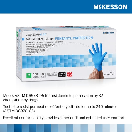 Question: What materials and barrier protection does Exam Glove McKesson Confiderm 6.8C Medium NonSterile Nitrile Standard Cuff Length Fully Textured Blue Chemo Tested / Fentanyl Tested,Packaging Type- Box provide?