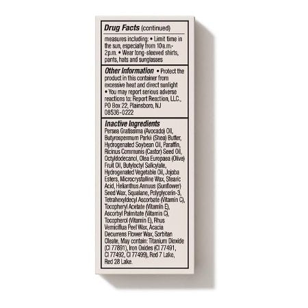 Ingredientes activos: Avobenzona 3%, Octisalato 5%, Homosalato 10%, Aceite de Persea Gratissima (Aguacate), Manteca de Butyrospermum Parkii (Karité), Aceite de Soja Hidrogenado, Parafina, Aceite de Semilla de Ricinus Communis (Ricino), Aceite de Fruto de Olea Europaea (Oliva), Octildodecanol, Salicilato de Butiloctilo, Aceite Vegetal Hidrogenado, Ésteres de Jojoba, Cera Microcristalina, Ácido Esteárico, Cera de Semilla de Helianthus Annuus (Girasol), Escualano, Poliglicerina-3, Ascorbato de Tetrahexildecilo (Vitamina C), Acetato de Tocoferilo (Vitamina E), Cera de Cáscara de Rhus Verniciflua, Cera de Flor de Acacia Decurrens, Oleato de Sorbitán. Puede contener: CI 77891, CI 77491, CI 77492, CI 77499, CI 15850, CI 42090, CI 77861, CI 45410, CI 19140