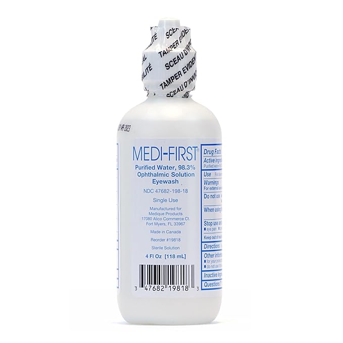 Medique fabrica productos de alta calidad para tratar y aliviar el dolor y las molestias. Medi-First Eyewash es una solución irrigadora estéril diseñada para eliminar partículas de los ojos rápidamente, brindando alivio instantáneo. Elaborada con solución salina isotónica tamponada, es perfectamente segura para ojos sensibles. Para abrir la botella flexible, simplemente gire la tapa para romper el sello de seguridad. Luego, aplique unas gotas en los ojos para eliminar rápidamente cualquier partícula suelta, polvo y suciedad. El lavaojos también es ideal para aliviar la fatiga ocular e irritación. La botella pequeña contiene 113 ml de solución lavaojos, diseñada para un solo uso. Una vez abierta y utilizada, deséchela correctamente. La botella portátil es práctica para viajes y uso personal. Debería estar en el botiquín de primeros auxilios y kit de supervivencia de cualquier hogar. Sin duda, el lavaojos es un recurso invaluable para tener a mano en lugares de trabajo, laboratorios, consultorios médicos y escuelas.