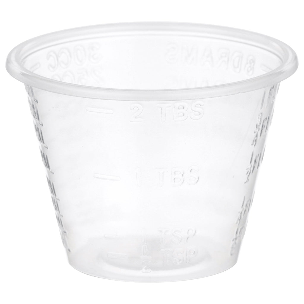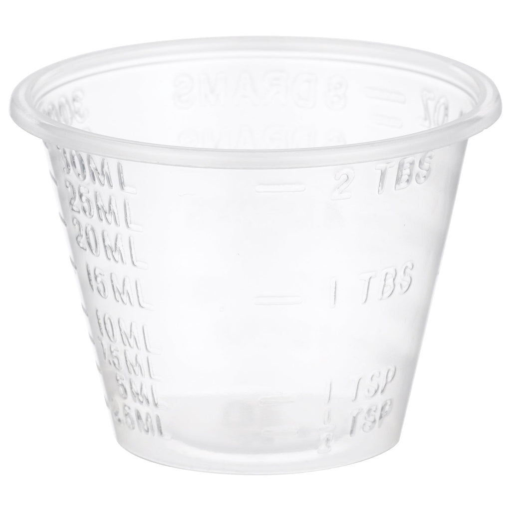 • Vasos para medicamentos de un solo uso, transparentes o translúcidos, de 1 onza líquida, con borde