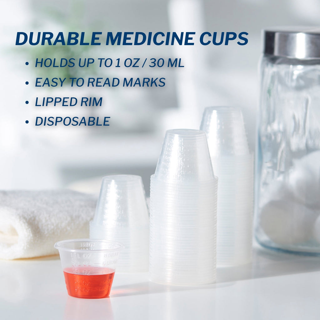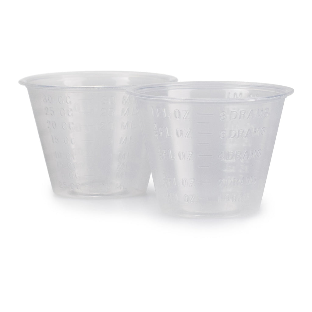 Para una medición precisa de medicamentos líquidos, estos vasos desechables cuentan con marcas graduadas en diversas medidas de volumen comunes. Los relieves claramente identificables indican cantidades de 1/8 a 1 onza líquida, de 1 a 8 dracmas, de 2,5 a 30 cc y de 2,5 a 30 mililitros. Un borde redondeado alrededor del exterior facilita la ingestión.