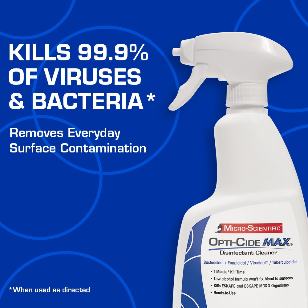 • Opti-Cide® MAX limpia y desinfecta superficies duras y no porosas como acrílico, metales (aluminio, latón, cobre, acero inoxidable, cromo), vidrio, plásticos (policarbonato, polipropileno, poliestireno y cloruro de polivinilo (PVC)), Plexiglas® y vinilo.